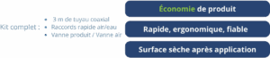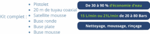 Avec le satellite moyenne pression et les appareils Fastnaet, produire une mousse dense est simple et efficace. La mousse est générée en bout de buse grâce à l’air intégré aux appareils Fastnaet, sans besoin d’air sur le satellite lui-même. Ce système garantit une diffusion homogène des produits.