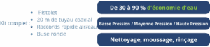 Ce pistolet utilise intelligemment un mélange d’air et d’eau pour réaliser d’importantes économies d’eau. Doté de différentes buses interchangeables, il permet de combiner les fonctions de nettoyage et de moussage en une seule action. Sa gâchette sécurisée autorise l’utilisation en haute pression, avec un réglage du débit d’eau effectué en amont, tandis que l’air se règle directement sur le pistolet.