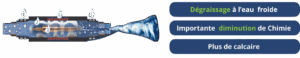 Ce dispositif restructure l’eau sans consommable ni énergie, rendant l’eau solvante et très mouillante, capable de dissoudre les graisses même à basse température. Il permet de réduire l’utilisation de détergents et désinfectants, tout en diminuant la consommation d’eau grâce à son efficacité constante.